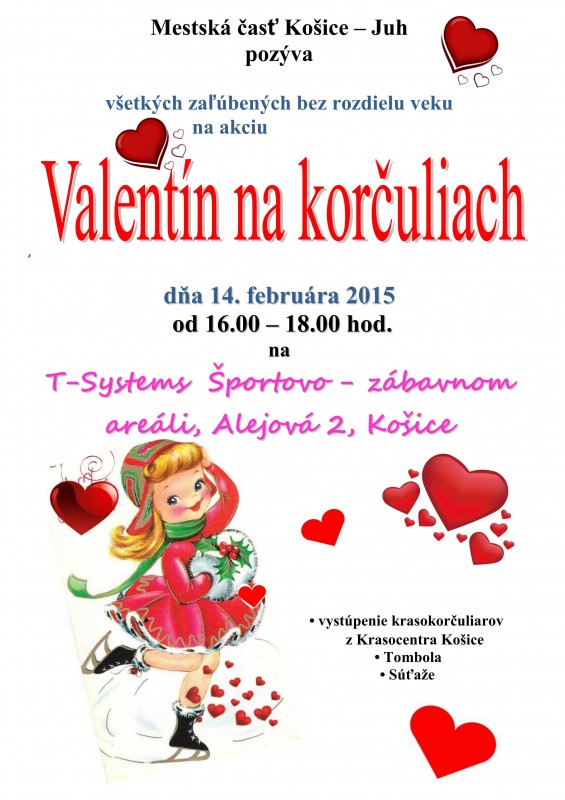 MČ Košice – Juh pozýva zaľúbencov na podujatie Valentín na korčuliach. Uskutoční na 14. februára od 16:00 do 18:00 hod. v T-Systems športovo-zábavnom areáli, Alejová 1.