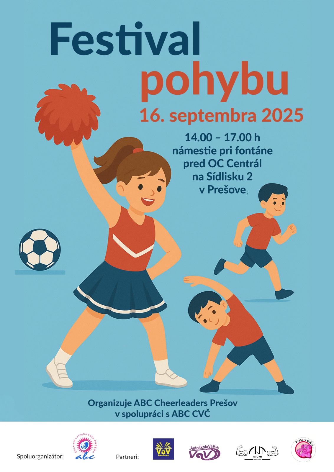 Športový klub ABC Cheerleaders, ABC Centrum voľného času (ABC CVČ) a ANT !FITGYM organizujú 1. ročník Festivalu pohybu, ktorý sa uskutoční v utorok 16. septembra 2025 od 14.00 do 17.00 hod. pri fontáne pred OC Centrál na Sídlisku 2 v Prešove.